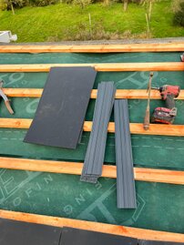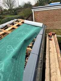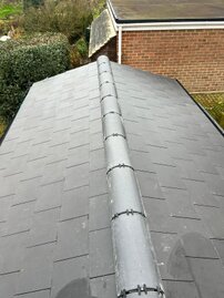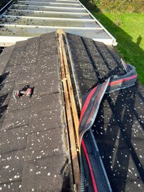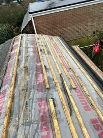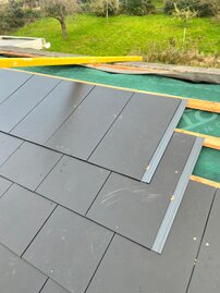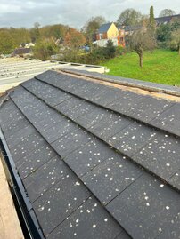 New garage roof to replace the old roof. It was badly leaking because somebody used concrete tiles with the wrong pitch. The old tiles were removed and a new composite roof tile was used to reduce the pitch and obtain a good water tight roof.